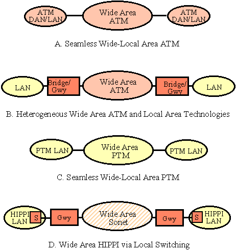 Figure 4-1B, Heterogeneous Wide Area ATM and Local Area technologies, shows the architecture used in the Blanca, Nectar, and Vistanet testbeds. ATM is again the switching technology used in the wide area network, but a non-ATM technology (in these instances, HIPPI) is used for local area connectivity. Both bridging and gateway approaches were investigated, and wide area transmission included SONET and all-optical infrastructures.