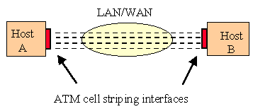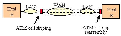 More general approaches to striping over ATM networks were explored by MIT as part of the Aurora testbed work, and in particular for cases where striping is introduced at points internal to the end-to-end path between hosts. This work examined different methods for achieving ATM layer striping synchronization in great detail, along with the tradeoffs associated with higher-layer striping choices. The conclusion was that ATM layer striping, introduced, say, at a point of local-to-wide area connection, coupled with destination host cell reordering will provide the broadest support for different choices of higher layer protocols and topologies (Figure 4-7).
