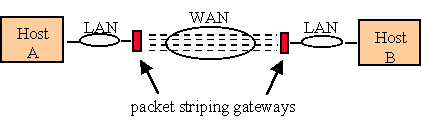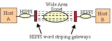 Consideration of equipment design complexity and cost associated with the choice of byte, cell, and packet striping units led to the selection of a packet striping unit, where packets in the initial implementation consisted of HIPPI frames. A distinct ATM VC is used for each 155 Mbps stripe, with the HIPPI frames which are received on the set of VCs sequentially combined into the original HIPPI stream for delivery to the local destination. This simplification is at the expense of performance, however, since at least four packets must be available for striping to achieve the full 622 Mbps rate when four 155 Mbps channels are used-if only one packet is sent, it will be at a rate of 155 Mbps.