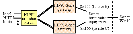 A host sending to a destination at another Casa site established a HIPPI connection between itself and the appropriate local gateway at its site, through one or more local HIPPI switches, for the duration of a single HIPPI packet transfer, with each packet constrained to the maximum IP packet size of 65 Kbytes. The local gateway is the endpoint of the HIPPI connection, exchanging HIPPI signaling with the local switch to control the flow of HIPPI bursts from the local host. A special gateway-gateway protocol is used across the wide area SONET link to send the HIPPI data and logical addressing information to the gateway at the next site and prevent buffer overflow in the receiving gateway.