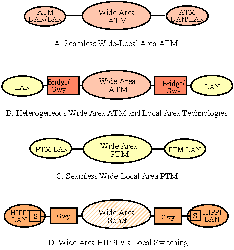 Figure 4-1B, Heterogeneous Wide Area ATM and Local Area technologies, shows the architecture used in the Blanca, Nectar, and Vistanet testbeds. ATM is again the switching technology used in the wide area network, but a non-ATM technology (in these instances, HIPPI) is used for local area connectivity. Both bridging and gateway approaches were investigated, and wide area transmission included SONET and all-optical infrastructures.