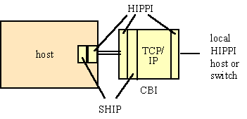 The LANL case was motivated by the need to support MPP supercomputers used in Casa which did not contain an internal high-performance TCP implementation, for example the TMC CM-2 and the Intel Paragon. A device called the Crossbar interface (CBI), originally designed to provide HIPPI networking support for hosts within Casa, was configured with an Intel 486 computer board and a Unix operating system to perform TCP/IP protocol processing. The CBI contained two HIPPI interfaces, one for connection to a host HIPPI interface and one for connection to a HIPPI switch or other HIPPI equipment (Figure 4-14).