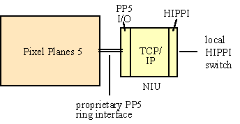 A second instance of a full TCP outboard implementation was the NIU (Network Interface Unit) developed by UNC in Vistanet. The NIU was developed to provide external HIPPI and transport protocol support for the Pixel Planes 5 (PP5) multicomputer, a very fast graphics rendering computer developed by UNC and used for Vistanet experiments. The NIU moved data directly to and from PP5 processors using the PP5's data ring architecture, and provided a HIPPI interface for connection to a HIPPI switch (Figure 4-15).